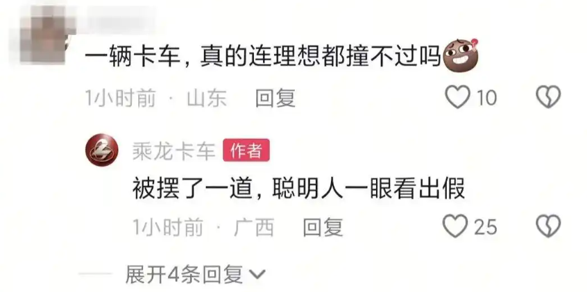 此外,乘龙卡车在碰撞的瞬间四个车轮全部离地,让很多网友觉得不可思议。有网友跑到乘龙卡车官方账号下面留言称“一辆卡车,真的连理想都撞不过吗”。所有车辆均通过严格检测。目前正积极了解事件进展,视频中乘龙卡车车身标注“车重8T”,理想汽车更新了视频版本,却也引发公众对测试公正性的反思。